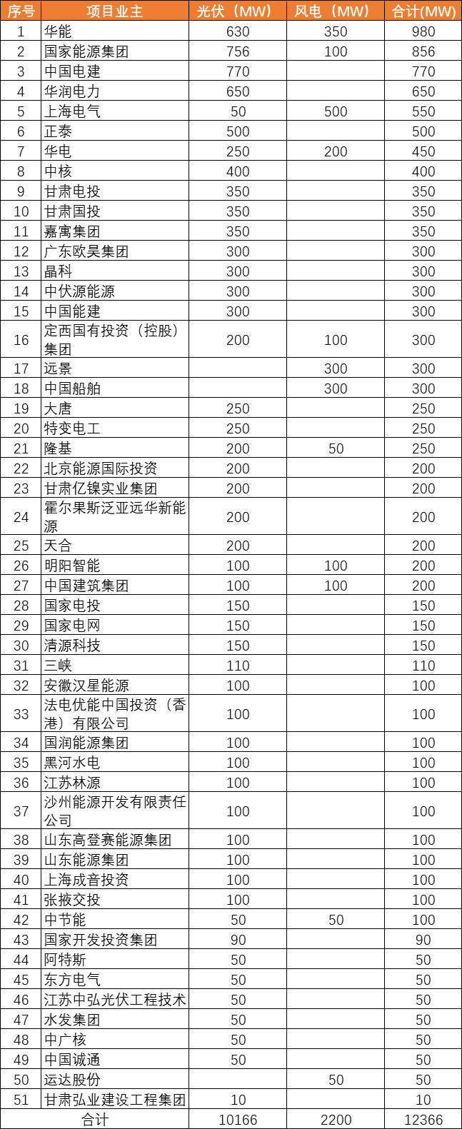 從上表看出,TOP10業(yè)主中分布了央企發(fā)電企業(yè)、央企建設(shè)集團(tuán)、民營光伏頭部企業(yè)以及甘肅當(dāng)?shù)氐膰衅髽I(yè)等。作為五大發(fā)電集團(tuán)之一的華能,大力進(jìn)擊新能源的步調(diào)是可以理解的。“雙碳”目標(biāo)提出以來,央企率先帶頭,華能集團(tuán)提出了“十四五”期間全力打造新能源、核電、水電三大支撐,加快提升清潔能源比重,積極實施減煤減碳;并規(guī)劃到2025年,發(fā)電裝機達(dá)到3億千瓦左右,新增新能源裝機8000萬千瓦以上,確保清潔能源裝機占比50%以上;到2035年,發(fā)電裝機突破5億千瓦,清潔能源裝機占比75%以上。