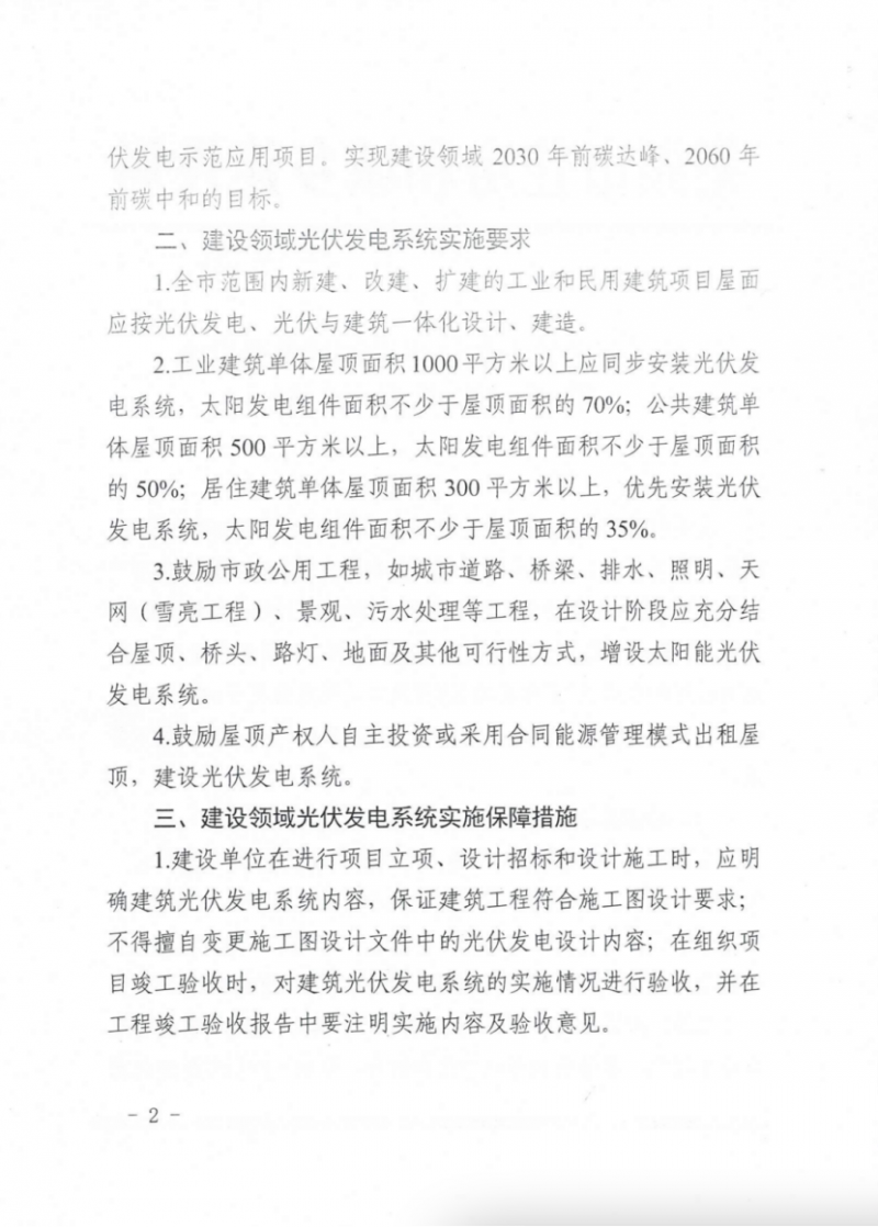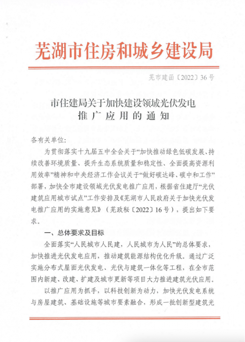 3月10日,安徽蕪湖市住建局發(fā)布關(guān)于加快建設(shè)領(lǐng)域光伏發(fā)電推廣應(yīng)用的通知,通知指出,全市范圍內(nèi)新建、改建、擴(kuò)建的工業(yè)和民用建筑項目屋面應(yīng)按光伏發(fā)電、光伏與建筑一體化設(shè)計、建造。其中,工業(yè)建筑單體屋頂面積1000平方米以上應(yīng)同步安裝光伏發(fā)電系統(tǒng),太陽發(fā)電組件面積不少于屋頂面積的70%。