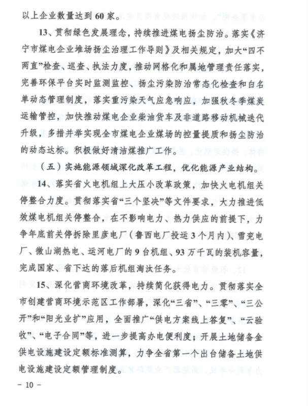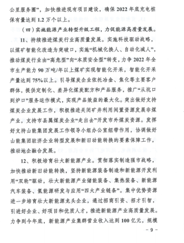 2、能源生產(chǎn)方面:(1)按照現(xiàn)行政策不變的情況下,2022年內(nèi)全市煤炭產(chǎn)量穩(wěn)定在5200萬噸左右;各類發(fā)電企業(yè)完成發(fā)電量490億千瓦時左右;(2)貫徹落實國家及省市煤電裝機相關(guān)政策,穩(wěn)步實施“上大壓小”,2022年煤電裝機容量穩(wěn)定在1050萬千瓦左右;(3)立足濟寧市資源稟賦實際,加快新能源開發(fā)利用和消納能力提升,力爭2022年底新能源總裝機實現(xiàn)350萬千瓦,新能源發(fā)電量完成45億千瓦時。