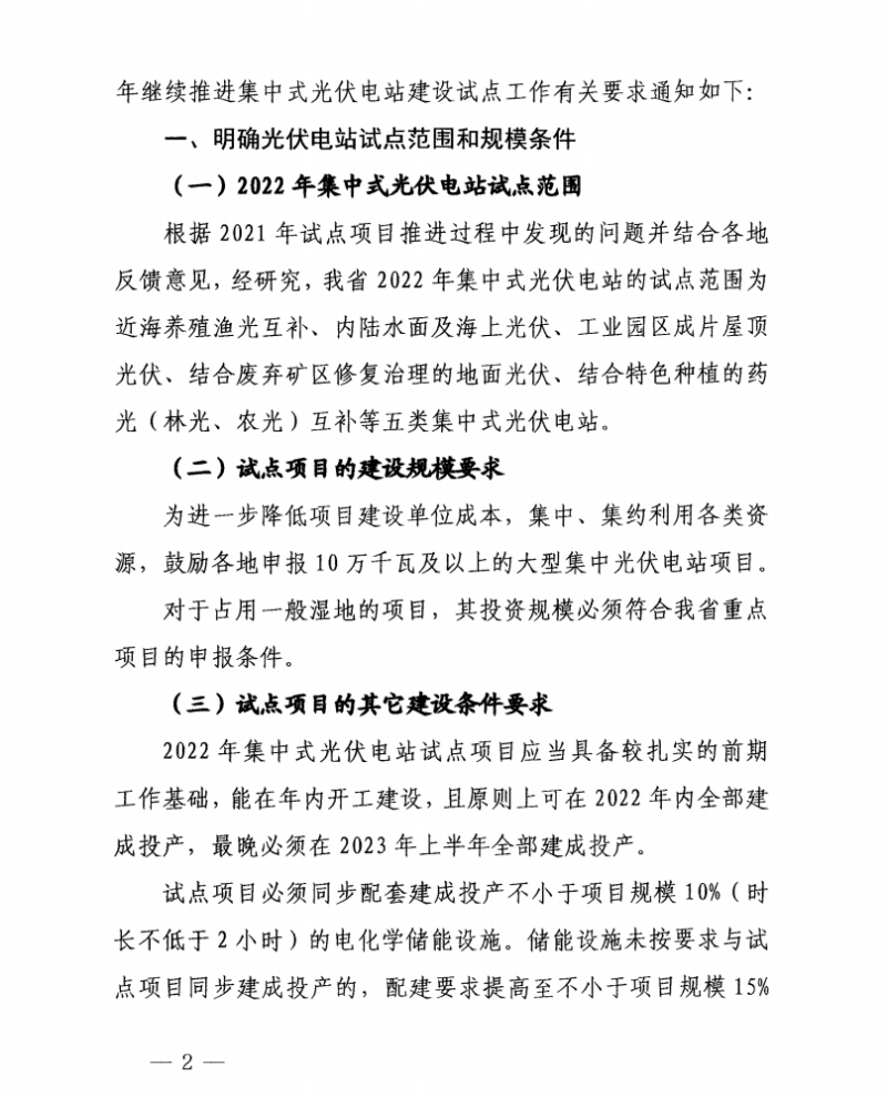 同步配套建成投產(chǎn)不小于項目規(guī)模10%(時長不低于2小時)的電化學儲能設施。儲能設施未按要求與試點項目同步建成投產(chǎn)的,配建要求提高至不小于項目規(guī)模15%(時長不低于4小時)。