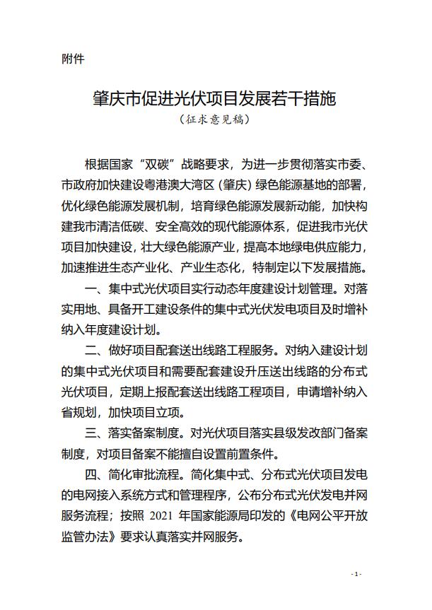 7月8日,廣東省肇慶市發(fā)改局發(fā)布關(guān)于公開(kāi)征求《肇慶市促進(jìn)光伏項(xiàng)目發(fā)展若干措施》(征求意見(jiàn)稿)意見(jiàn)建議的公告。