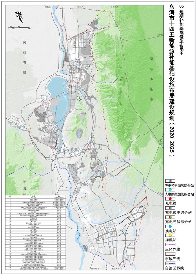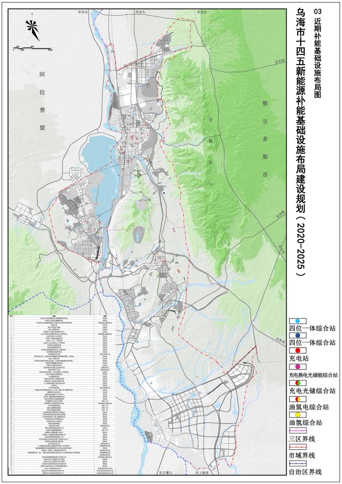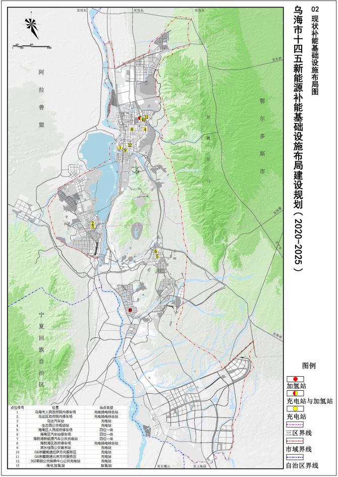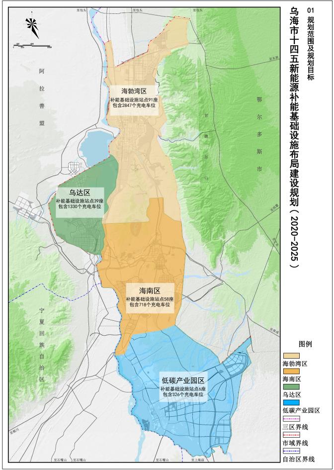 規(guī)劃范圍為全烏海市域范圍,總面積1754平方公里,主要涉及濱河新區(qū)、 海勃灣中心城區(qū)、烏達中心城區(qū)、海南中心城區(qū)和工業(yè)園區(qū)、物流園區(qū)內(nèi)的充電樁布局、換電站布局、加氫站布局和光伏儲能一體化設(shè)施布局。