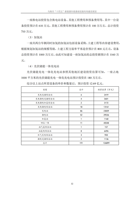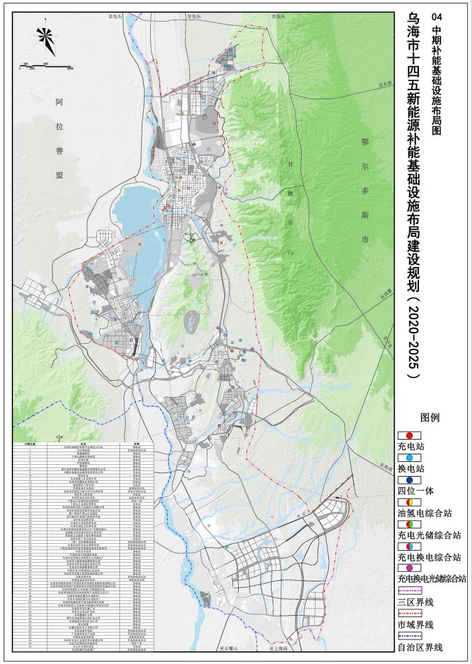 日前,內(nèi)蒙古自治區(qū)烏海市能源局印發(fā)《烏海市“十四五”新能源補能基礎(chǔ)設(shè)施布局建設(shè)規(guī)劃》,《規(guī)劃》提出發(fā)展目標:建設(shè)補能基礎(chǔ)設(shè)施共計194座,包含11座四位一體綜合站,加油加氫充電綜合站8座,加油加氣加氫綜合站1座,充電換電綜合站18座,充電換電加氫綜合站2座,充電換電光伏儲能綜合站4座,充電光伏儲能綜合站6座,換電光儲綜合站2座,加氣充電綜合站3座,充電站86座,換電站52座,加氫站1座。