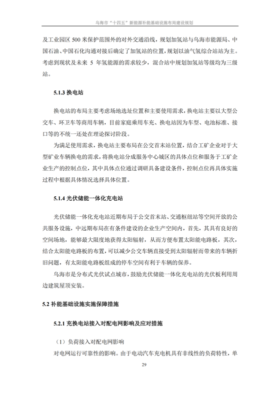 在“光伏儲能一體化充電站”方面,《規(guī)劃》提出,光伏儲能一體化充電站近期布局于公交首末站、交通樞紐站等空間開放的公共服務(wù)設(shè)施,中遠期布局在有條件建設(shè)的企業(yè)生產(chǎn)空間內(nèi),首先,其具有良好的空間場地,能夠最大限度地獲得太陽輻射,從而方便布置太陽能電路板,其次,結(jié)合太陽能電路板的布置,可以減少公交車輛直接受到太陽輻射而帶來的車輛折舊問題,有太陽能電路板組成的停車空間有利于車輛的保養(yǎng)。 烏海市是分布式光伏試點城市,鼓勵光伏儲能一體化充電站的光伏板利用周邊建筑屋頂安裝。