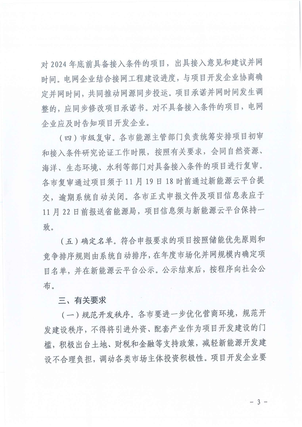 文件明確,規(guī)范開發(fā)秩序。各市要進一步優(yōu)化營商環(huán)境,規(guī)范開發(fā)建設秩序,不得將引進外資、配套產(chǎn)業(yè)作為項目開發(fā)建設的門檻,積極出臺土地、財稅和金融等支持政策,減輕新能源開發(fā)建設不合理負擔,調(diào)動各類市場主體投資積極性。項目開發(fā)企業(yè)要堅持實事求是,充分考慮項目經(jīng)濟性和可行性,科學確定配置儲能容量,杜絕盲目競爭、惡意競爭。