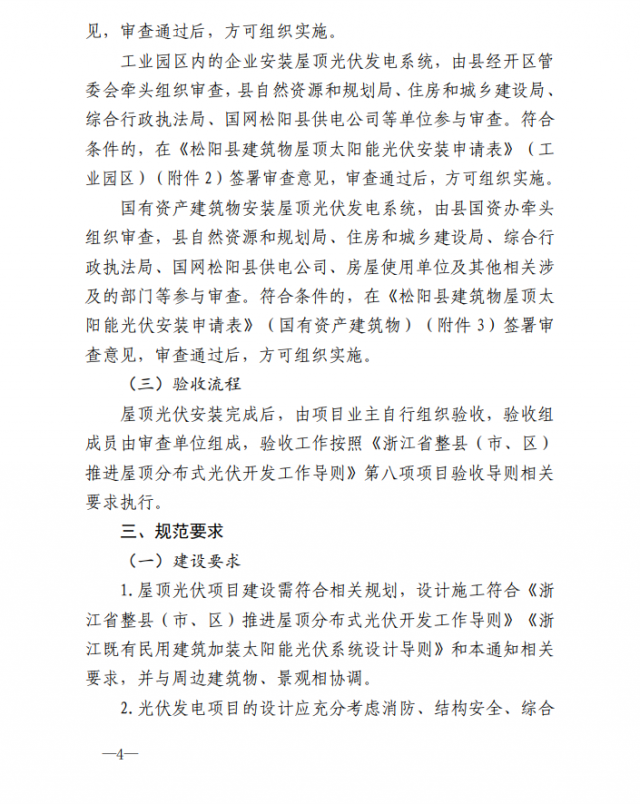 2、審查和驗收流程:建筑產(chǎn)權(quán)人或光伏項目業(yè)主提出申請,填寫《松陽縣建筑物屋頂太陽能光伏安裝申請表》并附相關(guān)申請資料,按照所屬區(qū)塊報屬地鄉(xiāng)鎮(zhèn)街道或縣經(jīng)開區(qū)管委會牽頭組織審查,國有資產(chǎn)屋頂建設(shè)光伏項目報縣財政局國資辦組織審查。自然資源和規(guī)劃局、住房和城鄉(xiāng)建設(shè)局、綜合新增執(zhí)法局、國網(wǎng)松陽縣供電公司等相關(guān)部門或其下屬派出機構(gòu)參與審查。符合條件的,各審查單位在申請表中簽署審查意見,方可組織實施。建設(shè)完成后,項目業(yè)主自主驗收,審查單位參與驗收,驗收工作按照《浙江省整縣(市、區(qū))推進屋頂分布式光伏開發(fā)工作導(dǎo)則》第八項項目驗收導(dǎo)則相關(guān)要求執(zhí)行。