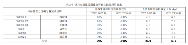 12月26日,紹興市建設局公示《紹興市綠色建筑專項規(guī)劃(2022-2030)(草案)》,其中提到,新建民用建筑(農(nóng)民自建住宅除外),應當按照國家和省有關(guān)標準利用可再生能源。可再生能源利用設施應當與建筑主體一體化設計,同步施工、同步驗收。新建民用建筑應采用可再生能源系統(tǒng),應配置太陽能系統(tǒng),滿足浙江省工程建設標準《民用建筑可再生能源應用核算標準》的要求。 至2025 年,紹興市各縣(市、區(qū))新建民用建筑可再生能源應用核算替代率達到 8%,太陽能光伏系統(tǒng)的裝機容量達到 22.0 萬 kWp。至 2030 年,紹興市各縣(市、區(qū))新建民用建筑可再生能源應用核算替代率達到 10%,太陽能光伏系統(tǒng)的裝機容量達到 33.0 萬 kWp。