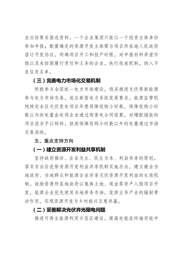 積極參與全國統(tǒng)一電力市場建設(shè),穩(wěn)妥推進光伏等新能源參與電力市場交易,適應(yīng)新型電力系統(tǒng)發(fā)展要求。能源監(jiān)管機構(gòu)核定全區(qū)光伏發(fā)電項目年度保障收購小時數(shù),保障收購小時數(shù)以內(nèi)的電量由電網(wǎng)企業(yè)通過購售電合同結(jié)算,對增配儲能的項目適當予以傾斜,鼓勵保障收購小時數(shù)以外的電量通過市場交易消納。