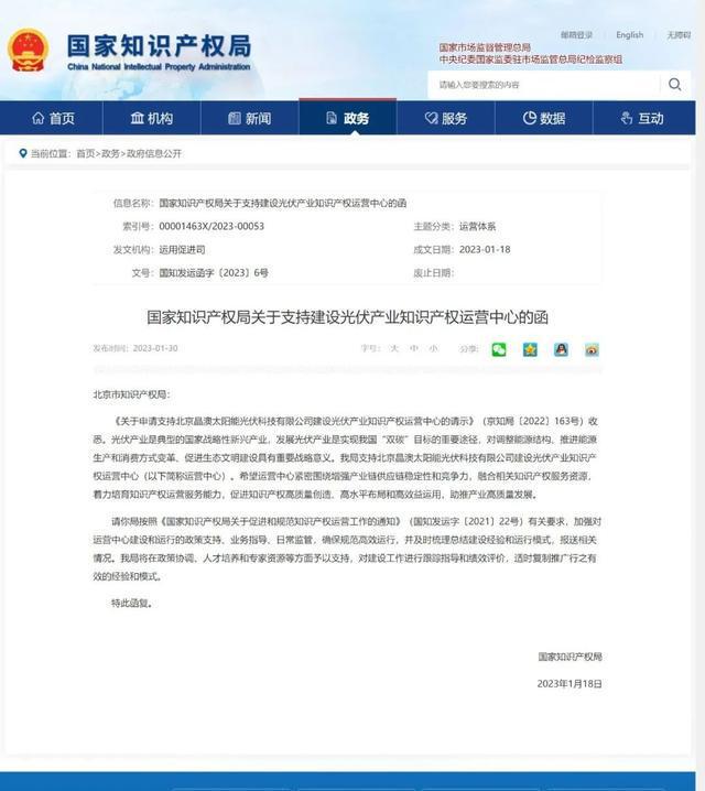 1月30日,國家知識產(chǎn)權局發(fā)布《關于支持建設光伏產(chǎn)業(yè)知識產(chǎn)權運營中心的函》,明確支持北京晶澳太陽能光伏科技有限公司(以下簡稱“晶澳科技”)建設“光伏產(chǎn)業(yè)知識產(chǎn)權運營中心”。這是光伏制造領域(不含多晶硅)首個國家級知識產(chǎn)權運營中心,體現(xiàn)了國家對晶澳科技在光伏制造領域科技實力和知識產(chǎn)權運作能力的肯定。