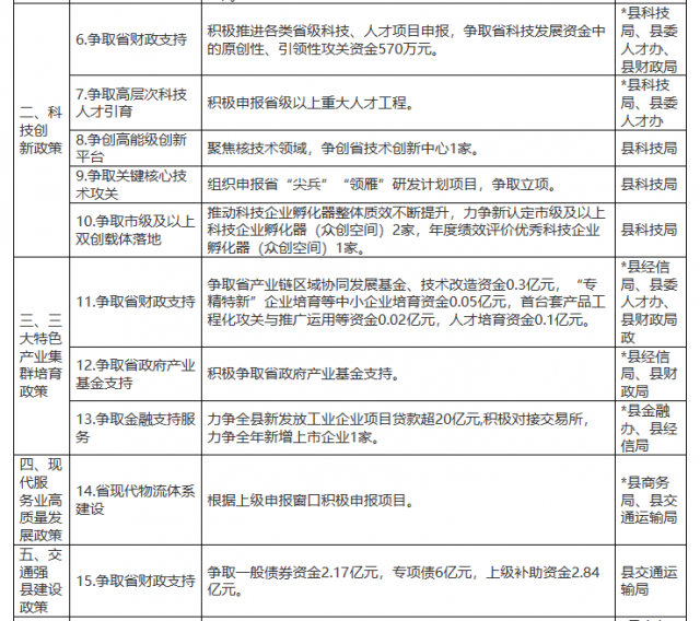 上述8個(gè)領(lǐng)域政策縣財(cái)政2023年預(yù)算安排資金,除交叉重疊部分外,支持總額約50億元。各領(lǐng)域政策縣級(jí)牽頭單位要根據(jù)文件要求,會(huì)同財(cái)政金融、自然資源、能源、人才等要素保障單位,抓緊出臺(tái)配套政策文件,及時(shí)做好政策的宣傳解讀、責(zé)任分解和落地實(shí)施,推動(dòng)政策精準(zhǔn)滴灌、直達(dá)快享,確?;鶎佑懈小⑷罕姭@益、企業(yè)得利。