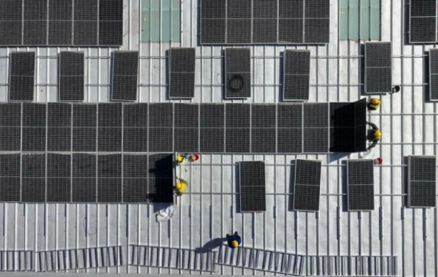 3月16日,工人在唐山市蘆臺(tái)經(jīng)濟(jì)開發(fā)區(qū)一家企業(yè)廠房屋頂上安裝太陽能光伏發(fā)電板(無人機(jī)照片)。