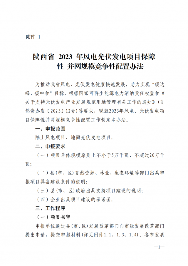 通知顯示,陜西省開(kāi)展競(jìng)爭(zhēng)性配置,確定2023年度新增風(fēng)電、光伏發(fā)電保障性并網(wǎng)規(guī)模為1000萬(wàn)千瓦。為確保項(xiàng)目質(zhì)量,保障市級(jí)權(quán)限,本次項(xiàng)目申報(bào)按照1:1.5的比例,結(jié)合區(qū)域資源條件、負(fù)荷特征和外送通道配套風(fēng)電、光伏發(fā)電項(xiàng)目的實(shí)際,對(duì)各市申報(bào)規(guī)模進(jìn)行明確,由各市共申報(bào)1500萬(wàn)千瓦,省發(fā)展改革委依據(jù)競(jìng)爭(zhēng)性配置辦法統(tǒng)一確定1000萬(wàn)千瓦納入2023年度建設(shè)方案。