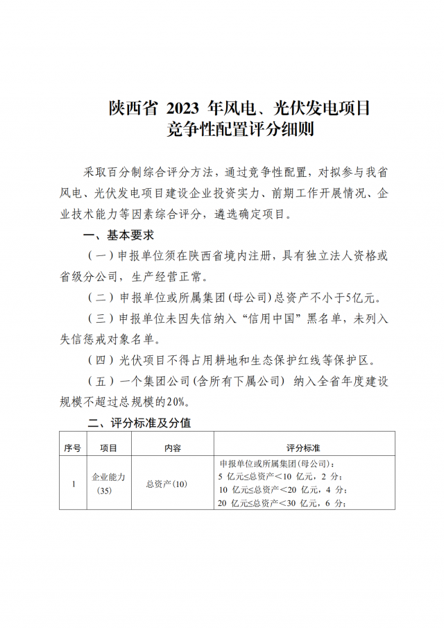 在光伏、風(fēng)電競(jìng)爭(zhēng)性配置評(píng)分細(xì)則上,要求申報(bào)單位須在陜西省境內(nèi)注冊(cè),具有獨(dú)立法人資格或省級(jí)分公司,生產(chǎn)經(jīng)營(yíng)正常。申報(bào)單位或所屬集團(tuán)(母公司)總資產(chǎn)不小于5億元。另外,一個(gè)集團(tuán)公司(含所有下屬公司)納入全省年度建設(shè)規(guī)模不超過(guò)總規(guī)模的20%。具體評(píng)分細(xì)則如下: