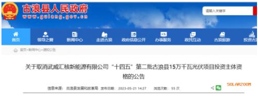 5日21日,甘肅省古浪縣發(fā)展和改革局發(fā)布《關(guān)于取消武威匯核新能源有限公司“十四五”第二批古浪縣15萬(wàn)千瓦光伏項(xiàng)目投資主體資格的公告》,宣布取消中核匯能甘肅新能源有限公司古浪縣15萬(wàn)千瓦光伏項(xiàng)目投資主體資格。
