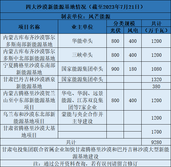根據(jù)公開信息不完全梳理,截至目前,在四大沙漠已明確93GW風(fēng)光大基地項目。