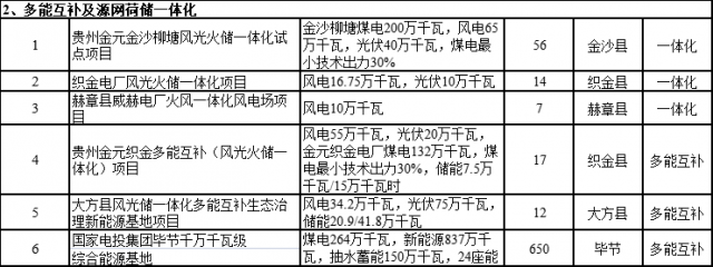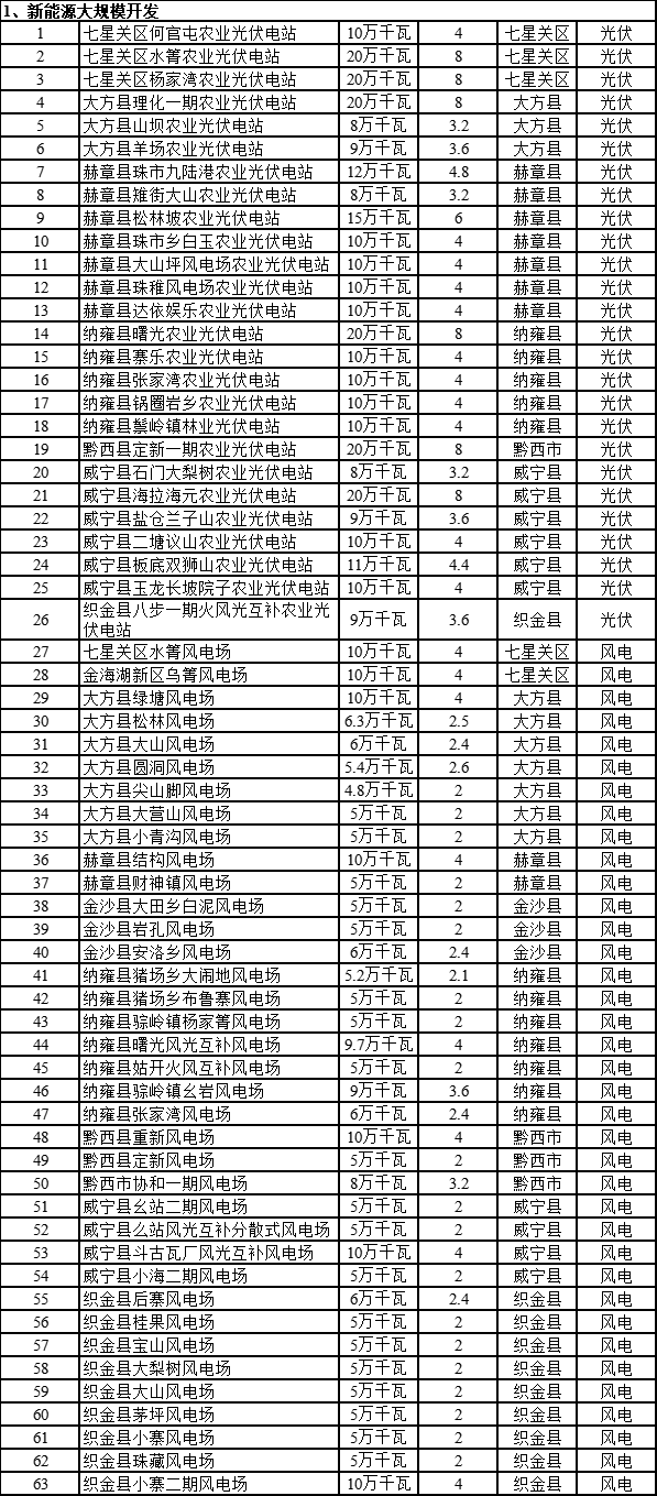 根據(jù)畢節(jié)市新型綜合能源基地建設(shè)重點項目表來看,涉及光伏、風電、風光制氫以及多能互補與源網(wǎng)荷儲一體化多個項目。其中光伏項目約26個,規(guī)模為3.19GW,風電項目為37個,規(guī)模為2.374GW。多能互補以及源網(wǎng)荷儲項目為6個,規(guī)模為11.62GW,光伏1.45GW,風電為1.8GW。其中,國家電投集團畢節(jié)千萬千瓦級綜合能源基地新能源規(guī)劃規(guī)模為8.37GW。