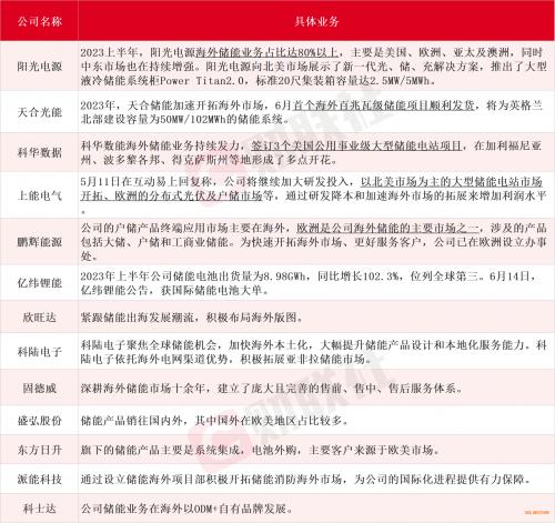 業(yè)內人士表示,隨著2023年美國光伏裝機重新恢復增長及ITC補貼力度的加大,預計美國儲能需求將恢復翻倍以上的增速。對此,不少儲能企業(yè)紛紛加速“出海”,以全面進軍海外市場為主要目標。據(jù)財聯(lián)社不完全整理,在海外有布局儲能相關業(yè)務的上市公司主要為陽光電源、天合光能、科華數(shù)據(jù)、上能電氣、鵬輝能源、億緯鋰能、欣旺達、科陸電子、固德威、盛弘股份、東方日升、派能科技、科士達等,具體情況如下: