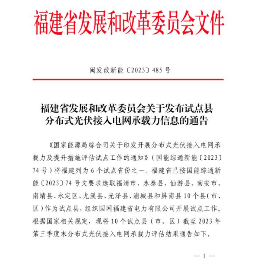 《通告》稱,《國家能源局綜合司關(guān)于印發(fā)開展分布式光伏接入電網(wǎng)承載力及提升措施評(píng)估試點(diǎn)工作的通知》(國能綜通新能〔2023〕74號(hào))將福建列為6個(gè)試點(diǎn)省份之一。按照國能綜通新能〔2023〕74號(hào)文要求,福建省選取福清市、永泰縣、仙游縣、南安市、南靖縣、永定區(qū)、尤溪縣、光澤縣、浦城縣和屏南縣10個(gè)縣(市、區(qū))作為試點(diǎn)縣,組織國網(wǎng)福建省電力有限公司開展試點(diǎn)工作。