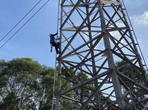 ▲香港中電集團員工攀爬鐵塔進行高空作業(yè)