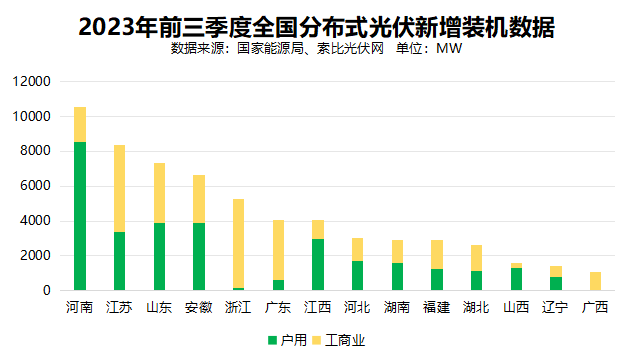 光伏發(fā)電方面,2023年前三季度,光伏新增裝機(jī)12894萬(wàn)千瓦(128.94GW),同比增長(zhǎng)145%,其中集中式光伏6180萬(wàn)千瓦(61.8GW),分布式光伏6714萬(wàn)千瓦(67.14GW),分布式光伏占比超過(guò)52%。分地區(qū)看,河南、山東、江蘇、湖北等11個(gè)省(自治區(qū)),前三季度光伏發(fā)電新增裝機(jī)超過(guò)5GW,其中7省的分布式光伏占比都超過(guò)一半。最高的河南省,分布式光伏占比超過(guò)98.6%,成為名副其實(shí)的“分布式光伏發(fā)展熱土”。