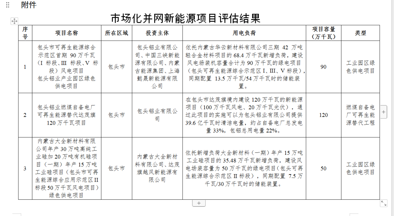 3個(gè)項(xiàng)目均納入市場(chǎng)化并網(wǎng)新能源項(xiàng)目清單,共配建新能源規(guī)模260萬千瓦,其中風(fēng)電240萬千瓦、光伏20萬千瓦。分別是:包頭鋁業(yè)有限公司、中國(guó)三峽新能源有限公司、內(nèi)蒙古能源集團(tuán)、上海懿晟新能源有限公司聯(lián)合投資的包頭鋁業(yè)產(chǎn)業(yè)園區(qū)綠色供電項(xiàng)目,項(xiàng)目容量90萬千瓦;2.包頭鋁業(yè)有限公司投資的包頭鋁業(yè)燃煤自備電廠可再生能源替代達(dá)茂旗120萬千瓦項(xiàng)目;3.內(nèi)蒙古大全新材料有限公司、達(dá)茂旗越風(fēng)新能源有限公司聯(lián)合投資的“內(nèi)蒙古大全新材料有限公司年產(chǎn)30萬噸高純工業(yè)硅加20萬噸有機(jī)硅項(xiàng)目(一期)年產(chǎn)15萬噸工業(yè)硅項(xiàng)目(包頭市可再生能源綜合應(yīng)用示范區(qū)II 標(biāo)段50萬千瓦風(fēng)電項(xiàng)目)綠色供電項(xiàng)目”。