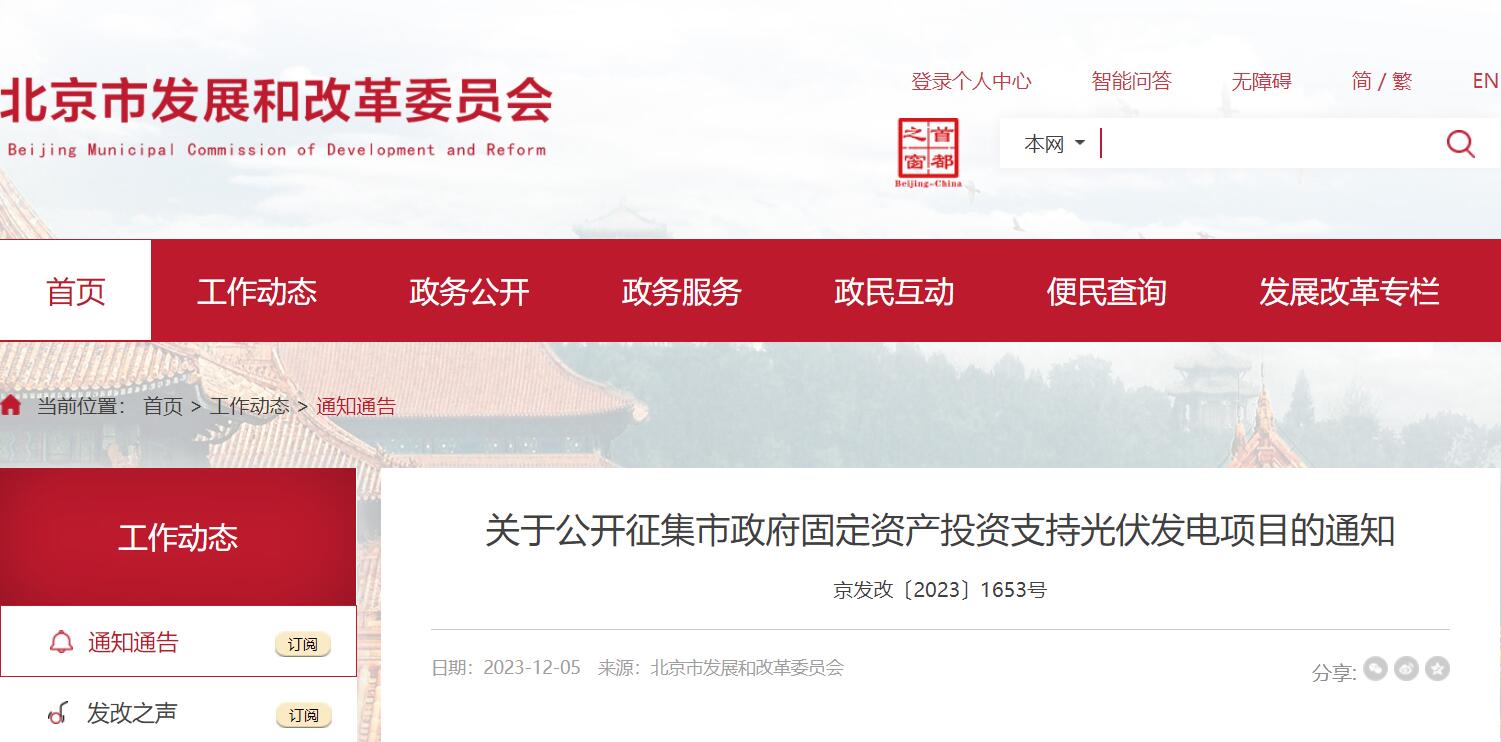 北京市發(fā)展和改革委員會關(guān)于公開征集市政府固定資產(chǎn)投資支持光伏發(fā)電項目的通知