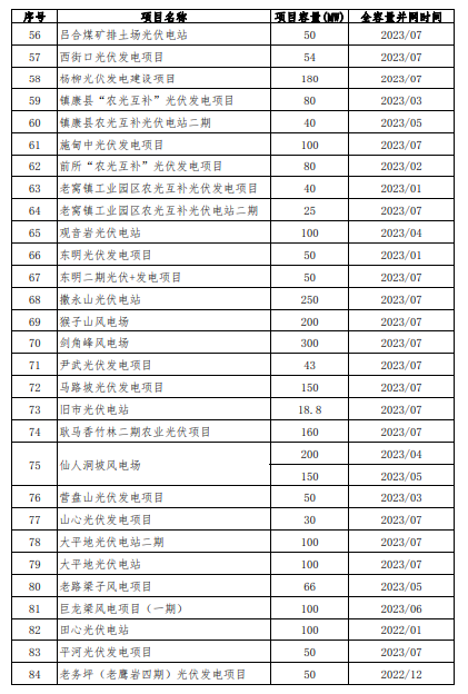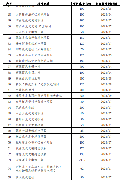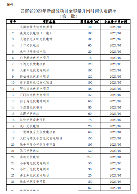 根據《云南省發(fā)展和改革委員會 云南省能源局關于云南省光伏發(fā)電上網電價政策有關事項的通知》(云發(fā)改價格〔2023〕319號)以及《云南省發(fā)展和改革委員會 云南省能源局關于進一步完善風電上網電價政策有關事項的通知》(云發(fā)改價格〔2023〕665號)文件精神,新能源全容量并網時間的認定由省能源局會同云南電網公司負責。為加強社會監(jiān)督,廣泛征求意見,現將經認定后的項目清單予以公示,有關情況如下: