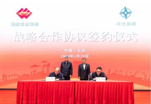國家能源集團(tuán)黨組書記、董事長劉國躍與中交集團(tuán)黨委書記、董事長王彤宙會(huì)談并見證簽約,集團(tuán)黨組成員、副總經(jīng)理?xiàng)铢i,中交集團(tuán)副總裁楊志超代表雙方簽約。