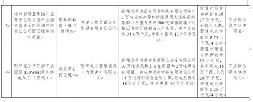 (四)明陽包頭市石拐工業(yè)園區(qū)350WM綠色供電項(xiàng)目。此本項(xiàng)目為變更項(xiàng)目,新增負(fù)荷內(nèi)蒙古華商稀土合金有限公司10萬噸多元稀土合金項(xiàng)目和2萬噸硼合金項(xiàng)目、包頭和順新材料有限責(zé)任公司1.1萬噸特種特合金項(xiàng)目等,用電負(fù)荷為18.2萬千瓦,年用電量10億千瓦時(shí)。配置市場化并網(wǎng)新能源35萬千瓦,其中風(fēng)電15萬千瓦、光伏20萬千瓦,配建電化學(xué)儲(chǔ)能5.25萬千瓦/4小時(shí)。