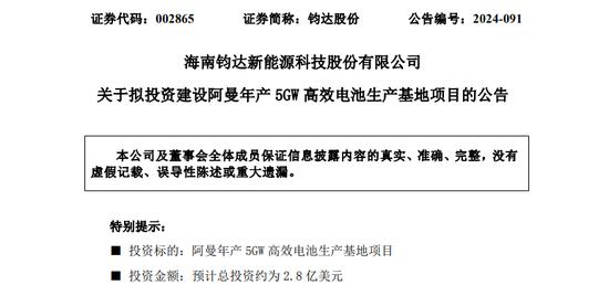 7月25日晚間,鈞達股份公告稱,公司擬于阿曼蘇丹國(下稱“阿曼”)投資建設(shè)5GW高效電池生產(chǎn)基地,該項目預(yù)計投資總額2.8億美元,項目建設(shè)周期約9個月,預(yù)計2025年建成投產(chǎn)。