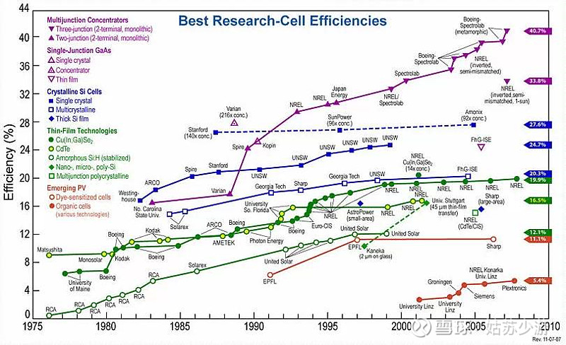 從十年前美國國家實(shí)驗(yàn)室的技術(shù)演進(jìn)圖來看,光伏的效率排序:異質(zhì)結(jié)(Multijunction)>單質(zhì)結(jié)(Single-junction)>多晶電池(Crystalline Si)>薄膜電池(Thin-film)。