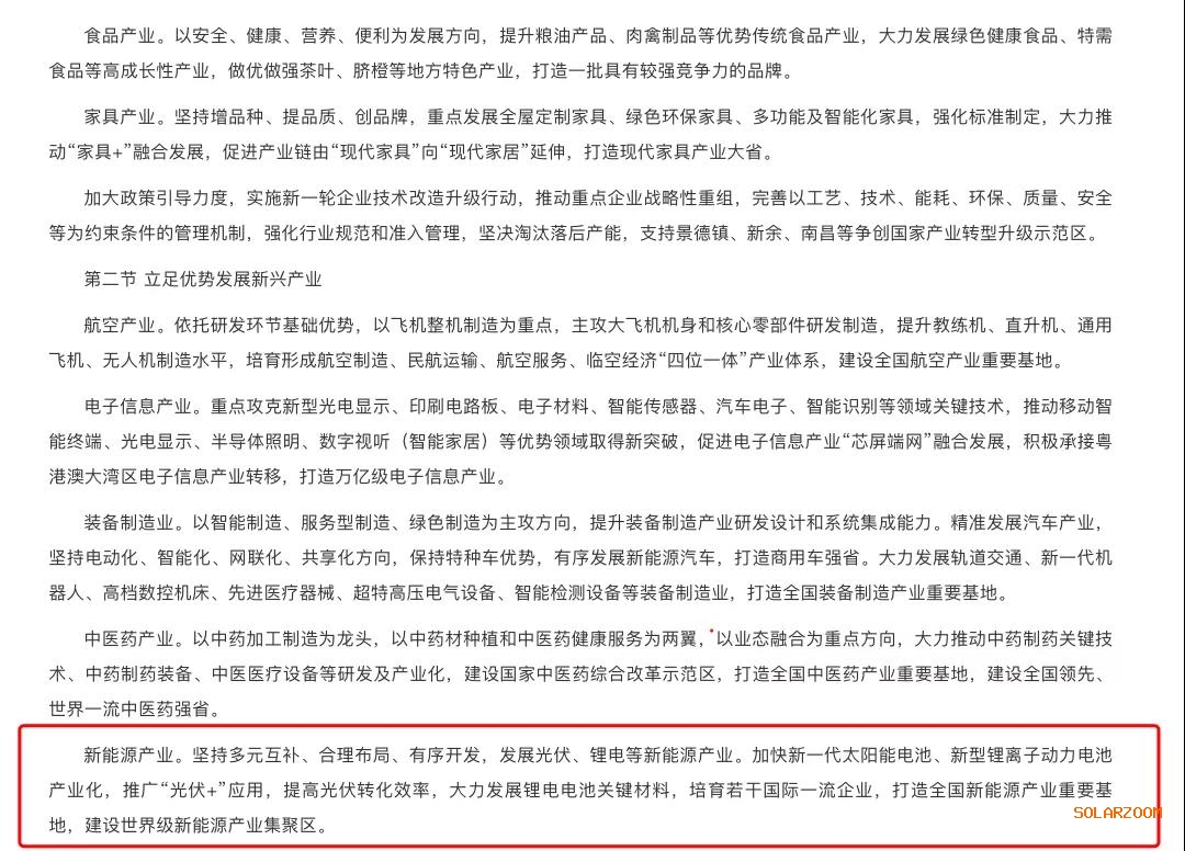 除發(fā)電端外,江西省在“十四五”期間,將加快新一代太陽能電池、新型鋰離子動力電池產業(yè)化,推廣“光伏+”應用,提高光伏轉化效率,大力發(fā)展鋰電電池關鍵材料,培育若干國際一流企業(yè),打造全國新能源產業(yè)重要基地,建設世界級新能源產業(yè)集聚區(qū)。