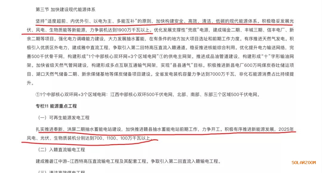 文件顯示,江西省將在“十四五”期間堅持“適度超前、內優(yōu)外引、以電為主、多能互補”的原則,加快構建安全、高效、清潔、低碳的現(xiàn)代能源體系。積極穩(wěn)妥發(fā)展光伏、風電、生物質能等新能源,到2025年力爭裝機達到1900萬千瓦以上。其中,風電、光伏、生物質裝機分別達到700、1100、100萬千瓦以上。
