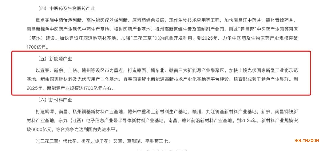 以宜春、新余、上饒、贛州等設區(qū)市為重點,打造贛西、贛東北、贛南三大新能源產業(yè)集聚區(qū)。加快上饒光伏國家新型工業(yè)化示范基地、新余國家硅材料及光伏應用產業(yè)化基地、宜春國家鋰電新能源高新技術產業(yè)化基地等平臺建設,培育形成若干特色產業(yè)集群。到2025年,新能源產業(yè)規(guī)模達1700億元左右。