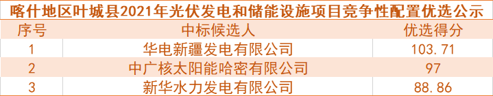 喀什地區(qū)葉城縣2021年光伏發(fā)電和儲能設(shè)施競爭性配置于2021年3月19日在葉城縣人民政府網(wǎng)發(fā)布項(xiàng)目公告,于2021年3月27日16時在葉城縣建設(shè)工程交易中心會議室進(jìn)行優(yōu)選會議,優(yōu)選結(jié)果如下: