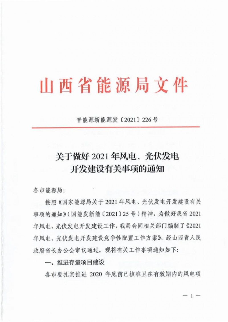 8月26日,山西省能源局印發(fā)《關于做好2021年風電、光伏發(fā)電開發(fā)建設有關事項的通知》。通知中對山西省的2021年的光伏、風電工作做了規(guī)劃。