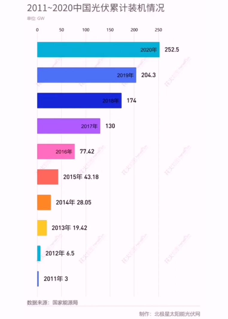 從2011年至2020年,中國光伏累計裝機從3GW增長至252.5GW,根據國家能源局數據,截至2021年6月30日,中國光伏累計裝機已達267GW,十年飆漲880%。