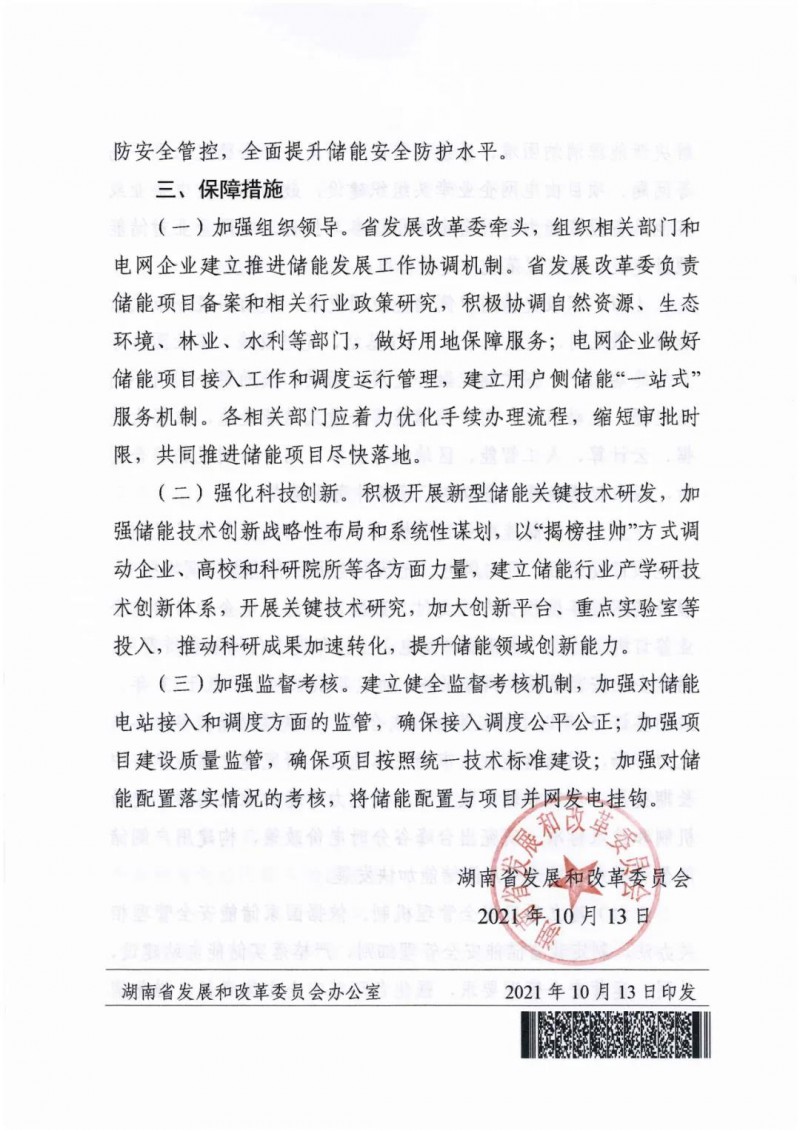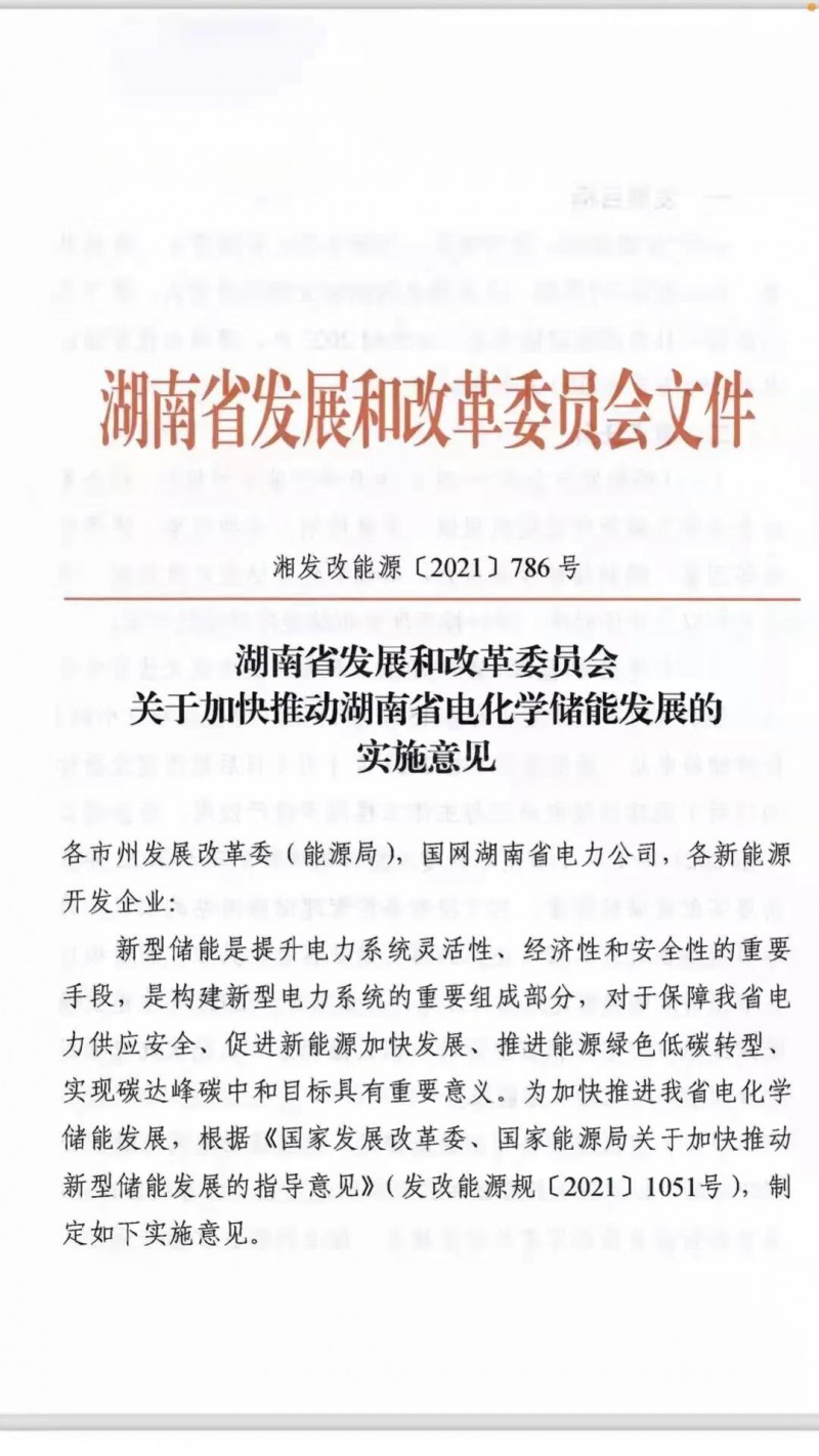 10月13日,湖南省發(fā)改委下發(fā)《關(guān)于加快推動(dòng)湖南省電化學(xué)儲(chǔ)能發(fā)展的實(shí)施意見》,文件明確以發(fā)展電網(wǎng)側(cè)獨(dú)立儲(chǔ)能為重點(diǎn),集中規(guī)劃建設(shè)一批電網(wǎng)側(cè)儲(chǔ)能電站,力爭(zhēng)到2023年建成電化學(xué)儲(chǔ)能電站150萬千瓦/300萬千瓦時(shí)以上。