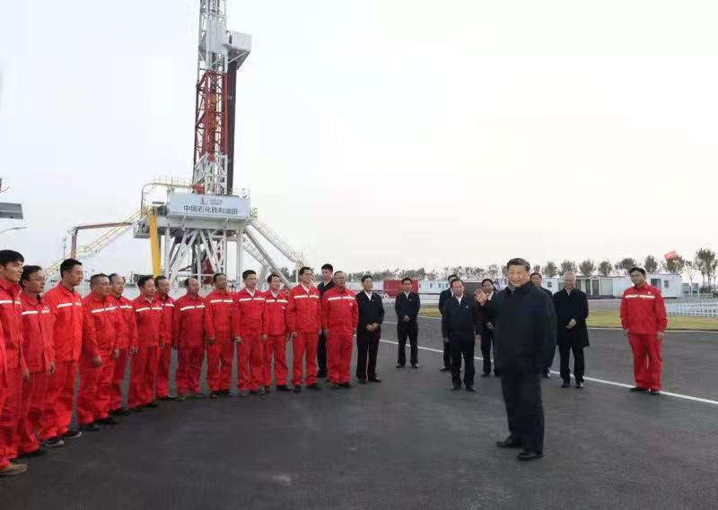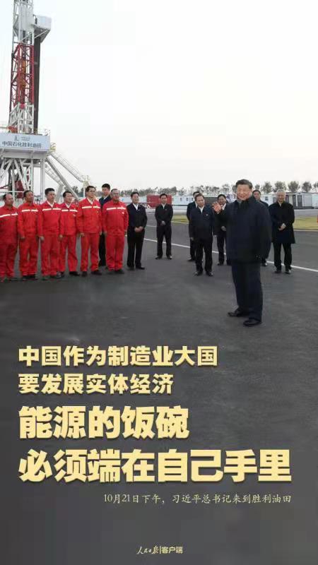 10月21日下午,習(xí)近平總書記來到勝利油田,登上鉆井平臺,察看作業(yè)情況,看望慰問石油工人。今年是勝利油田發(fā)現(xiàn)60周年。習(xí)近平代表黨中央向廣大石油職工致以誠摯問候。習(xí)近平指出,石油能源建設(shè)對我們國家意義重大,中國作為制造業(yè)大國,要發(fā)展實體經(jīng)濟(jì),能源的飯碗必須端在自己手里。希望你們再創(chuàng)佳績、再立新功。
