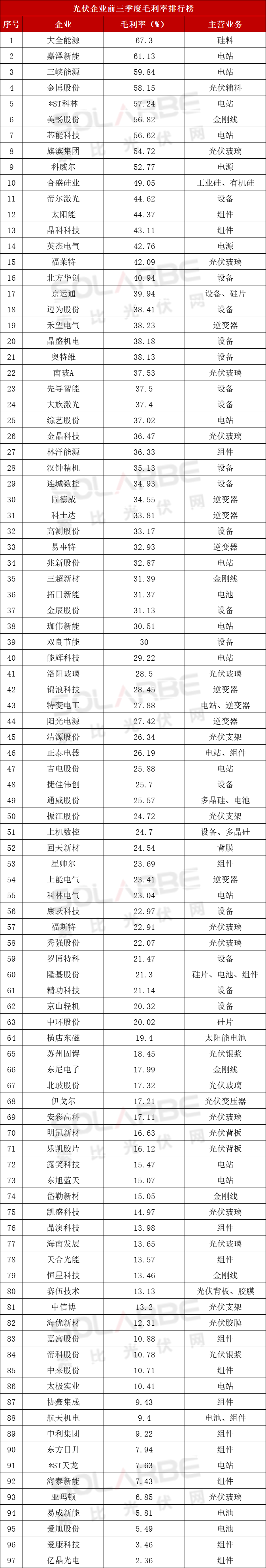 而前三季度毛利率在50%以上的光伏企業(yè)有9個(gè),多為光伏原材料、輔材以及電站運(yùn)營企業(yè),它們是大全能源67.3%、嘉澤新能61.13%、三峽能源59.84%、金博股份58.15%、*ST科林57.24%、美暢股份56.82%、芯能科技56.62%、旗濱集團(tuán)54.72%、科威爾52.77%。