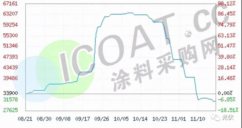 有機硅則隨著工業(yè)硅價格下行,行情急轉(zhuǎn)直下,目前報價在31000-32000元/噸左右,較10月初63000元/噸的高位幾近腰斬。聊城芫澤化工、山東東岳化工、山東魯西化工報價在30400元/噸左右,短短兩個月價格暴跌32000元/噸。