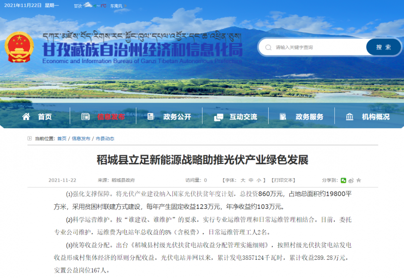 ⑶統(tǒng)籌收益分配。出臺《稻城縣村級光伏扶貧電站收益分配管理實施細(xì)則》,按照村級光伏扶貧電站發(fā)電收益形成村集體經(jīng)濟的原則分配收益。光伏電站并網(wǎng)以來,累計發(fā)電3857124千瓦時,累計收益289.28萬元,安置公益崗位167人。