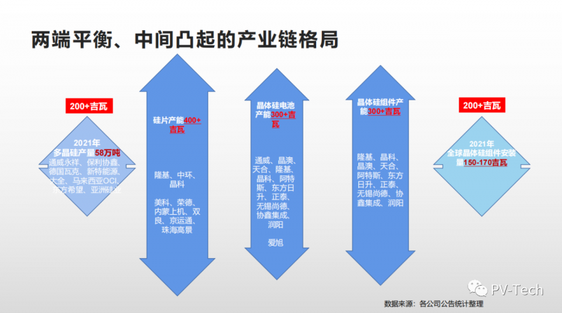 呂錦標(biāo)在報(bào)告里也公布了全球7家主要企業(yè)和4家新進(jìn)入企業(yè)的擴(kuò)產(chǎn)情況,預(yù)測2022年多晶硅供應(yīng)可以超過80萬噸,比今年增加20萬噸。主要產(chǎn)能集中在下半年投產(chǎn)。對應(yīng)明年200吉瓦的裝機(jī)預(yù)測,多晶硅供應(yīng)大于需求。有望推動(dòng)價(jià)格下行。