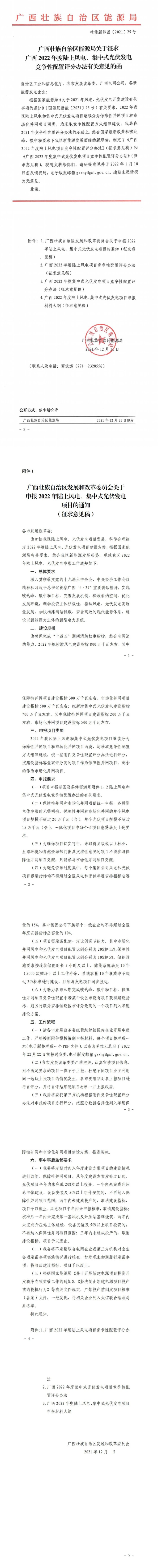 12月31日,廣西壯族自治區(qū)能源局發(fā)布了關(guān)于征求廣西2022年度陸上風(fēng)電、集中式光伏發(fā)電競(jìng)爭(zhēng)性配置評(píng)分辦法有關(guān)意見的函。廣西2022年擬新增風(fēng)電建設(shè)指標(biāo)800萬(wàn)千瓦左右,其中,保障性并網(wǎng)項(xiàng)目300萬(wàn)千瓦左右,市場(chǎng)化并網(wǎng)項(xiàng)目500萬(wàn)千瓦左右;擬新增集中式光伏發(fā)電700萬(wàn)千瓦左右,其中保障性并網(wǎng)項(xiàng)目200萬(wàn)千瓦左右,市場(chǎng)化并網(wǎng)項(xiàng)目500萬(wàn)千瓦左右。