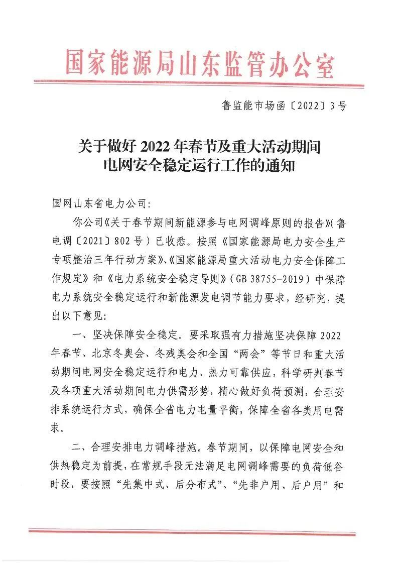 2022年1月22日,國家能源局山東監(jiān)管辦公室發(fā)布《關于做好 2022年春節(jié)及重大活動期間電網(wǎng)安全穩(wěn)定運行工作的通知》,提出: