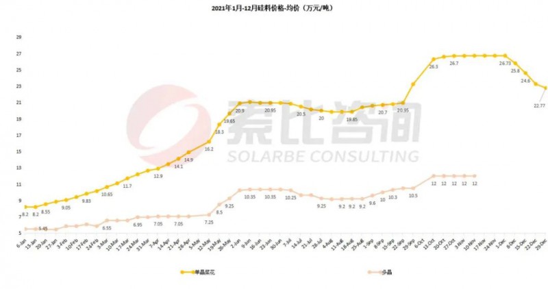 索比咨詢預(yù)計(jì),2022年硅料價格保持高位運(yùn)行。受新產(chǎn)能投放節(jié)奏影響,預(yù)計(jì)Q2前硅料價格保持高位,年初價格在200元/KG,年底將達(dá)100元/KG。
