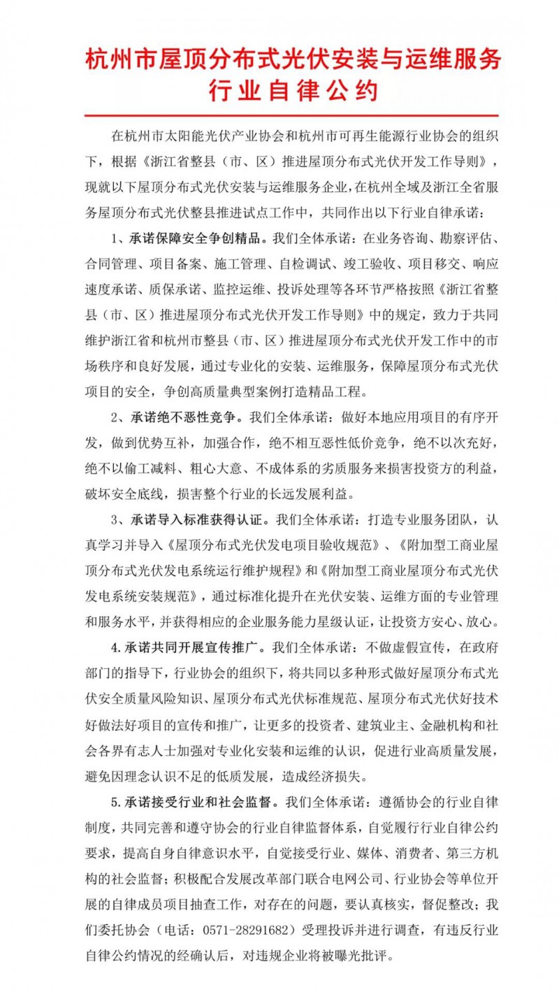 為踐行該《導則》在杭州全域及浙江全省的推廣應用,在杭州市太陽能光伏產(chǎn)業(yè)協(xié)會和杭州市可再生能源行業(yè)協(xié)會的組織下,浙江正泰新能源開發(fā)有限公司、龍焱能源科技(杭州)有限公司、杭州桑尼能源科技股份有限公司、杭州福斯特光伏發(fā)電有限公司、杭州帷盛科技有限公司、德鄰聯(lián)合工程有限公司、浙江交投新能源投資有限公司、浙江天裕能源有限公司、浙江維旺合縱能源科技有限公司、杭州城市能源有限公司、泛太能源環(huán)境(浙江)有限公司、浙江寰泰新能源有限公司、浙江拓華能源科技有限公司、潔云電力工程(杭州)有限公司、杭州眾能光電科技有限公司共十五家光伏企業(yè),根據(jù)《導則》條款,聯(lián)合簽署了《杭州市屋頂分布式光伏安裝與運維服務行業(yè)自律公約》,帶頭向社會公開承諾加強行業(yè)自律,共同維護浙江省和杭州市整縣(市、區(qū))推進屋頂分布式光伏開發(fā)工作中的市場秩序和良好發(fā)展。