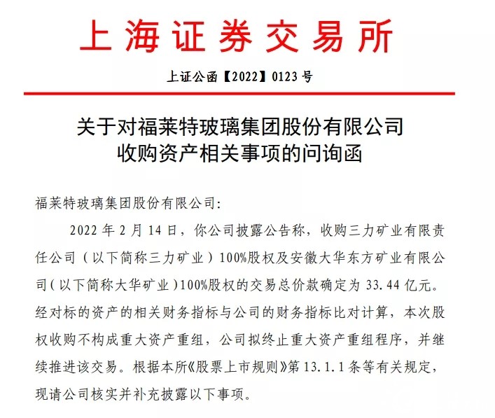 上交所近期發(fā)布問詢函,就光伏玻璃巨頭福萊特對三力礦業(yè)、安徽大華東方礦業(yè)等100%股權(quán)的收購案進(jìn)行問詢,兩項收購額總計為33.44億。