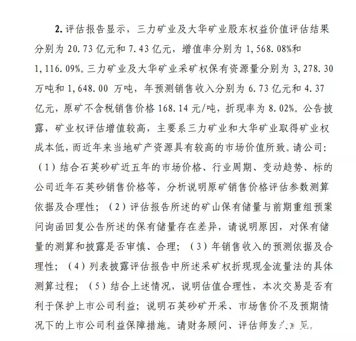 同時,上交所也指出,上述兩家(擬被收購)公司的股東權(quán)益價值評估結(jié)果分別為20.73億和7.43億,增值率為1568%和1116%,兩家公司的年預(yù)測銷售收入為6.73億和4.37億,請福萊特對石英砂礦的近五年市場價、行業(yè)周期、變動趨勢和標(biāo)的公司近年來石英砂銷售價等,分析說明原礦銷售價評估參數(shù)測算依據(jù)及合理性。同時也說明年銷售收入的預(yù)測依據(jù)、估值的合理性等。