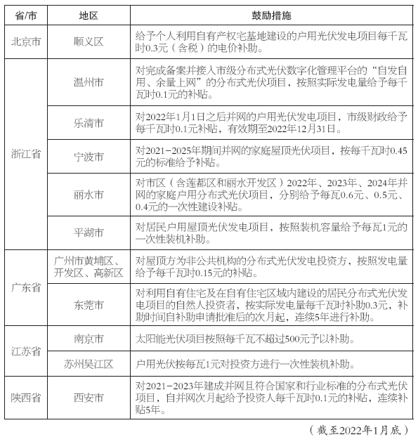 2022年新建項(xiàng)目國家補(bǔ)貼政策還未明確,戶用光伏平價(jià)上網(wǎng)已被業(yè)內(nèi)認(rèn)為是大勢所趨。據(jù)不完全統(tǒng)計(jì),截至2022年1月底,已有北京、浙江、江蘇等省(市)的二十多個(gè)地區(qū)提出了分布式光伏新增項(xiàng)目電價(jià)補(bǔ)貼、補(bǔ)助或獎(jiǎng)勵(lì)政策,部分地區(qū)還為戶用光伏項(xiàng)目設(shè)置了專項(xiàng)補(bǔ)貼,以期吸引更多社會資本進(jìn)入當(dāng)?shù)貞粲霉夥袌觥?/p>